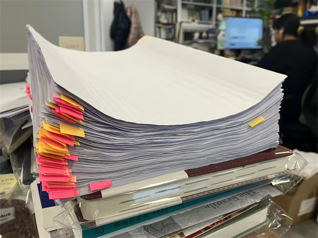 临近岁末,俞诗逸发来一张照片,画面里厚厚一摞纸,页缝间贴满便签。这是他最近审读的书稿,历史学家卢汉超的《霓虹灯外:20世纪初日常生活中的上海》。这部著作2022年由上海书店出版社引进出版,获得广泛好评,销量也不错,2026年要再版。尽管是旧书新做,身为责任编辑的俞诗逸仍不敢懈怠,又从头至尾细细过了一遍,结果,又捉出一些“虫”。