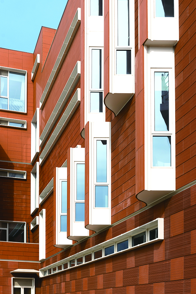 设计大楼内外及屋顶暗藏了5个花园,外墙放弃玻璃幕墙而采用干挂陶板,既安全又环保。在光照强烈时,肉眼便可清晰感知其色彩纹理的变化,由轻及重,像极了一个人随着年岁增长而沉淀的韵味……