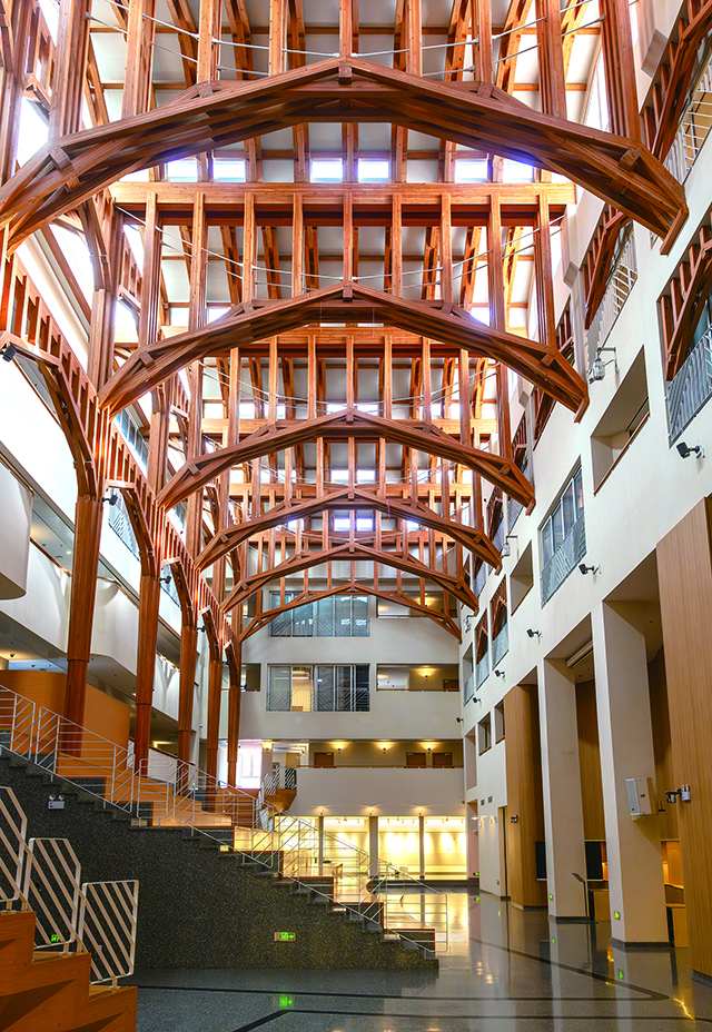 步入大堂,抬头仰望,编木拱给人以震撼。“这其实就如宋画中的‘虹桥’,是中国大道至简的传统木构艺术,连接柱间,扮演梁的角色以连接原有结构,最后形成穹拱的屋架结构起到支撑作用。”阮昕介绍。