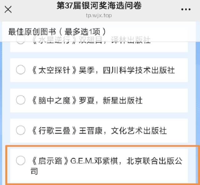 第37届“银河奖”元旦假期期间启动了海选投票。眼尖的读者在11个类目,上百篇候选作品中看到了邓紫棋长篇科幻小说《启示路》的名字。业内人士告诉青年报·青春上海记者,由于邓紫棋的人气很高,她的作品通过网友初选问题不大,至于后面的复选和终选则需要比拼实力。