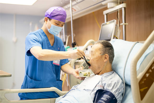 医疗护理员王帅给病人喂午餐