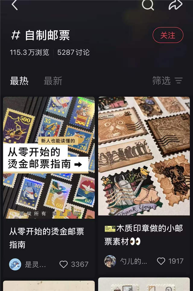 这样有趣却并不费事的手工受到许多爱好者的欢迎。小红书上,自制邮票有115.3万浏览量,5287条讨论,用木质印章做邮票、绘制烫金材质邮票,创作者在邮票上的创意无限。