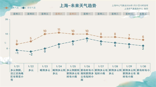 今天本市以多云到阴天气为主,沿江沿海地区有零星小雪。早晨大部地区跌至冰点以下,各区气温在-4℃到-1℃之间,局部有薄冰或冰冻。市区徐家汇站最低气温-1.5℃,打破今冬最低气温纪录,非常寒冷。