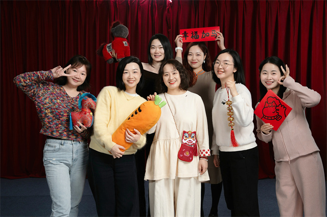 复旦大学管理学院融媒体部的7名女生组团前往,拍了一张集体照。孙睿穿了一袭白衣白裤,一眼相中道具里的红色醒狮挎包,上身效果十分出挑。同事们有的拿着小马,有的拿着“幸福加马”,有的拿着一串鞭炮,红红火火共迎新春。