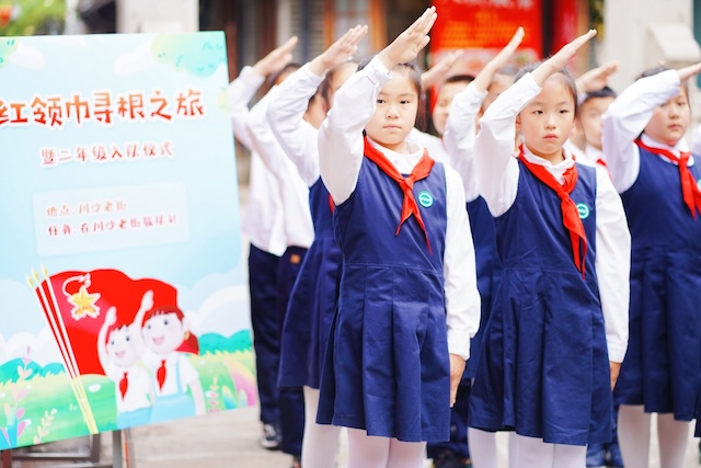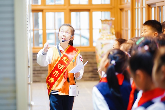 “几十年前,这些先烈就在观澜小学的校园学习和生活,对于孩子们来说,他们的故事距离更近、也更容易引起共鸣。”为了让小学生队员听得懂、看得懂,严尧分层分级设计了不同活动。比如,针对三至五年级队员,开展“红领巾讲解员”活动,让他们依托校史展开讲解。一、二年级的学生不仅可以通过高年级队员的讲述了解校史,每学期还有不同梯度的学校史环节。尤其特别的是,学校将二年级首批入队学生的入队仪式放在了川沙烈士陵园,队员们先在学校周边开展“红领巾寻根之旅”,再在校友先烈长眠之地加入少先队,让入队仪式更加庄严、更加难忘。