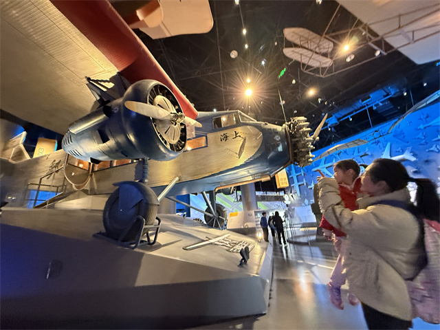 “飞行探秘”展区互动体验丰富,几乎覆盖全年龄段。飞行法则、飞机工厂、航空体验、追梦里程、风洞体验场五大板块中,目前仅风洞体验仍在调试。观众既可走进上海首条民用航线主力机型“福特三发”穿越时空,也能体验飞行员训练用的四轴平衡器,还能模拟飞行操作、尝试跳伞,甚至化身行李箱探索机场奥秘。