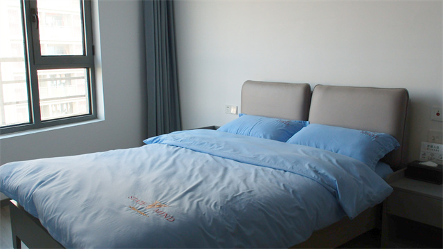 据季卓卿介绍,盛青榕寓于2024年加入了全市的青年驿站项目,目前共有两套三居室房源,分设男生房和女生房,每套含三个独立房间,均配备密码门锁保障隐私。“我们是租赁小区,驿站设施配备齐全,完全能实现拎包入住。”季卓卿带着调研团队逐一参观,客厅作为公共空间宽敞明亮,每个卧室都配有独立阳台、落地窗和顶天立地的衣柜,空调、床品等生活用品一应俱全,刷牙洗脸等洗漱用具也统一提供。厨房区域冰箱、厨具配备齐全,青年可自行做饭;房间层高适宜且楼间距开阔,部分房间还能欣赏湖景,光线条件极佳。