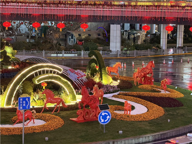 世纪大道流光溢彩,重点区域灯火璀璨。以砂岩广场为起点布置奔腾赤马灯饰,浦东标志性日晷雕塑下铺满落地红灯笼,沿线布置大型发光灯笼、中国结、立体灯牌及“满天星”灯饰,打造3.9公里的“星光大道”。世博大道沿线点缀的红灯笼,一路延伸至“东方之冠”中华艺术宫,烘托出这座中国红建筑巨构的磅礴气势。小陆家嘴明珠环岛中央设置马年主题艺术花坛,上方环形连廊悬挂满天星灯珠,下方布置骏马造型灯笼,上下呼应营造星河环绕、灯笼辉映的喜庆场景。浦东国际机场布置的红灯笼与新春主题海报,第一时间为来往旅客带来新春的问候。