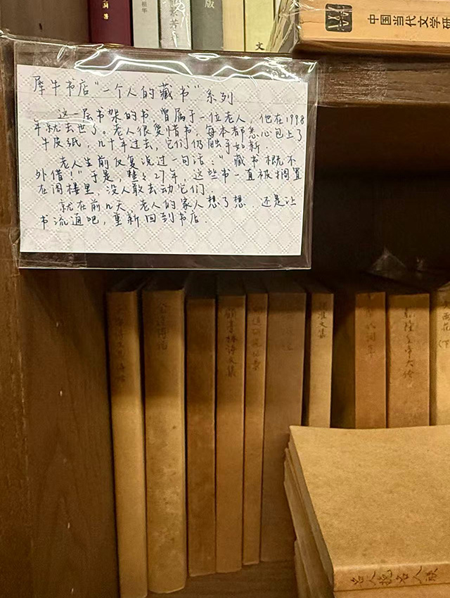 “一个人的藏书”系列便是如此。这批书的主人是一位27年前便已故去的老先生。他生前爱惜书,每一本都用牛皮纸包好,细心存放。老先生的家人一直留着这批书,最近才决定让它们流通,给有需要的人。为此,庄见果辟出专区展陈。《诗经今注》《陆游年谱》《顾亭林诗文集》……一本本书构成一段鲜活的阅读史和生命史,伫立于前,仿佛在进行一段跨越时空的对话。