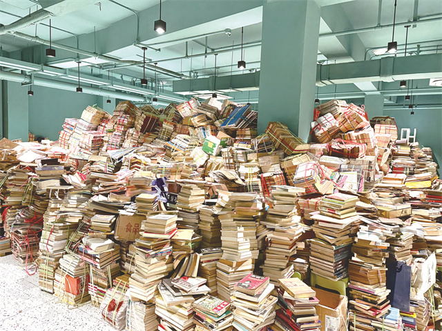 小朱书店在宝山仓库里的“书山”。在这座“书山”隔壁,就是一个社区图书馆。馆内图书全都来自小朱书店。