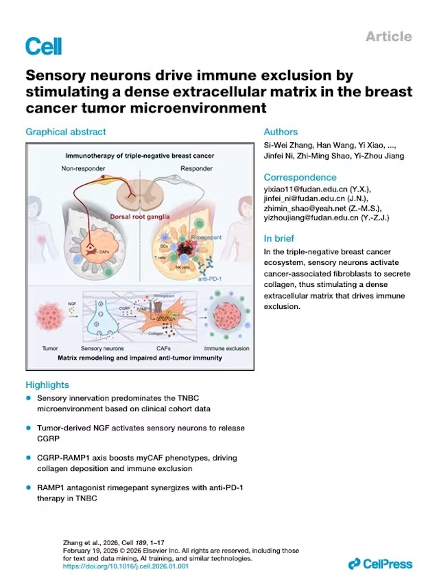 2月6日凌晨,复旦大学附属肿瘤医院乳腺肿瘤中心主任邵志敏教授、复旦大学附属肿瘤医院副院长江一舟教授领衔团队,联合复旦大学脑科学转化研究院倪金飞教授团队,在国际顶刊《细胞》(Cell)在线发表研究论文。