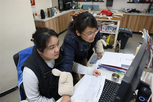 王敏(左)与同事交流工作。