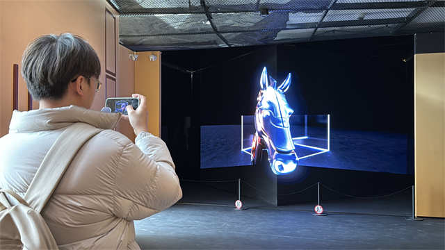 康熙皇帝御用的櫜鞬,乾隆帝拉过的弓,都能在这次特展中看到。其中,汉代陶彩绘马头、唐代三彩马、三彩胡人骑马狩猎俑、铜“圣旨”合符、银虎钮“镶黄旗护军统领印”等珍贵文物以及《乾隆帝盔甲乘马图》《郎世宁万吉骦轴》等数字展品纷纷亮相,结合数字演绎,生动展现马在历史中的多元意义。此外,展览还融入裸眼3D、AI等科技手段,设置了多个沉浸式互动展项,让观众在可看、可感、可玩中深入理解马的文化与科学内涵。“珍贵文物的展陈,可以更多地让人了解到马背后的历史与故事。”倪闽景介绍说。