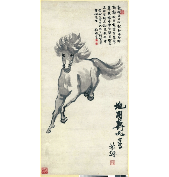 在中国人的绘画意识中,马代表着力量,即便如戈湘岚画中的那八匹马,虽看上去静若处子,但也蕴含着一种巨大的能量,随时可能迸发。上海美术馆藏有一幅刘海粟先生的中国画《马》。虽是独马,但笔墨豪放,将马匹风驰电掣、一往无前的神韵尽显无遗。