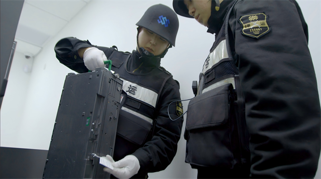 半小时后,他准时抵达队部。对于押运员而言,一天的工作是从一套严苛的程序开始的。换上制服,套上防弹背心,戴上钢盔,并领取防暴枪,一身的装备加起来重达20多斤。穿戴整齐后,两名押运员、两名业务员和一名驾驶员组成的5人车组,要对重达4.5吨的运钞车进行细致检查。