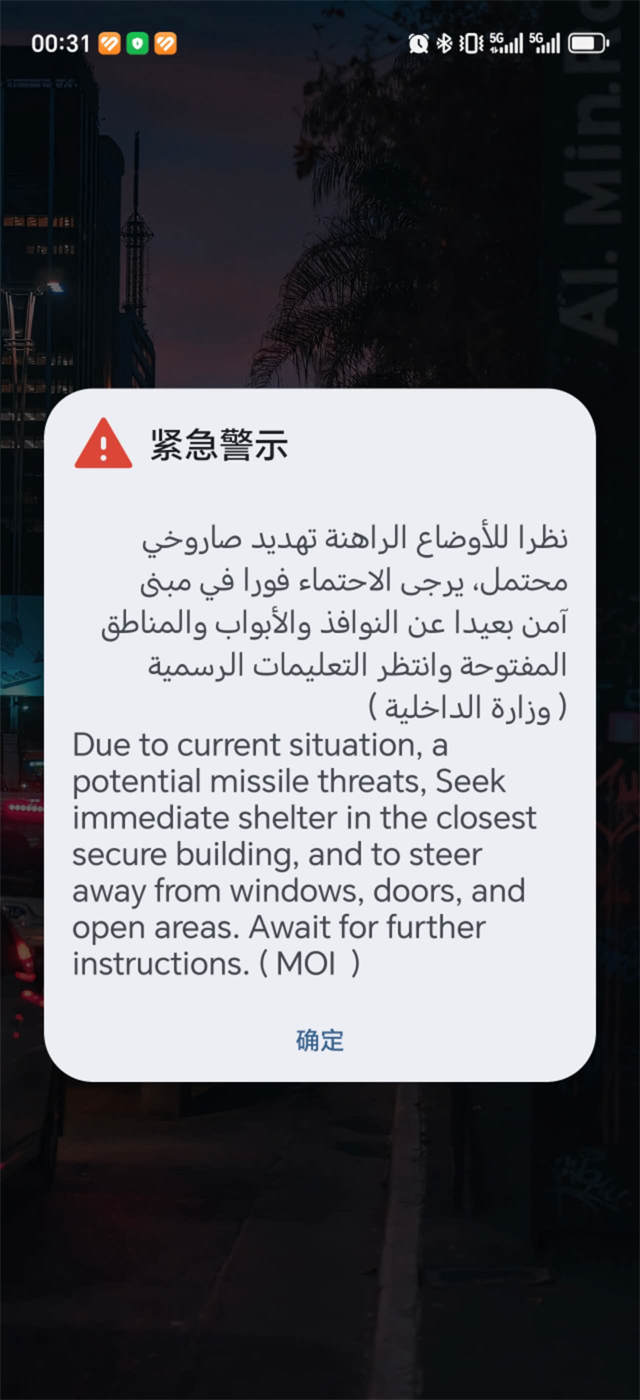 当地时间28号晚上9点左右,她收到公司通知,迪拜上空有导弹飞射和拦截的消息,不允许随便外出。但她当时并未重视此事。直到3月1日凌晨12点半,她的手机突然发出刺耳的警报声,弹窗消息提醒有潜在的导弹威胁,不要靠近门窗,寻找安全掩体。