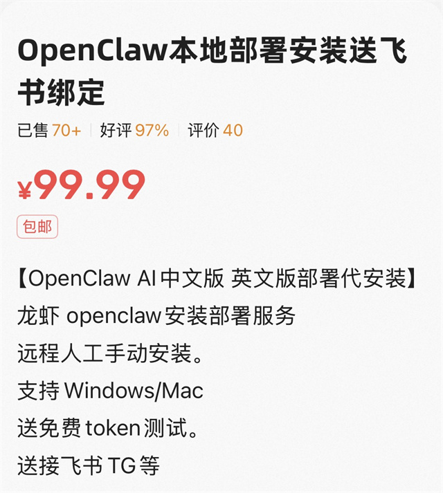 随着OpenClaw走红,嗅觉敏锐的“淘金者”纷纷入局。在闲鱼平台上,各类OpenClaw安装服务应运而生,价格从几十元到199元不等。一家标价99.9元、提供本地部署和飞书绑定的个人卖家,3月份已收获1053次“想要”,售出70余份,收入超7000元。程序员刘先生也将OpenClaw本地部署发展为副业,挂出100元至400元不等的服务,目前已进账近5000元。