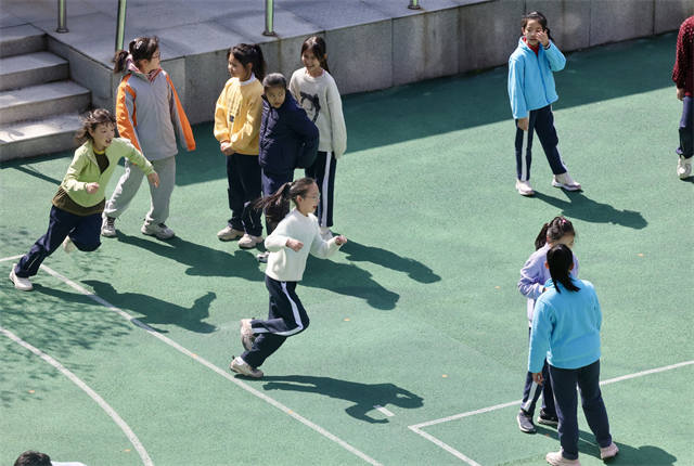 在陆倍倍看来,课间从10分钟变成15分钟,学生们更欢乐了,可以有更充分的时间放松身心。比如走廊上的“跳房子”,上面是有二十四节气相关知识的,以往学生在课间跳一跳就回教室了,现在玩的同时也能看一看这些传统文化知识,玩得更尽兴了,“我们希望孩子们能利用这15分钟多动一动,放松身心,远眺一下,并不一定非得有多大的运动强度,但要有持续的放松,这也是为了在后一堂课中集中专注度去学习”。