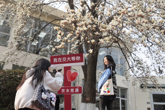 曾善美来自广东,那里四季都是绿茵茵的,她本科在湖南读书,人生头一次在江南感受春天,这份特有的冲击感让她十分欣喜。对于对春天的喜欢和追逐,两位学子上周末已经出动了。“我们刚刚打卡了龙华寺的玉兰花,非常漂亮,却不如交大这棵来的繁盛和高俊”,她们如此鉴定。