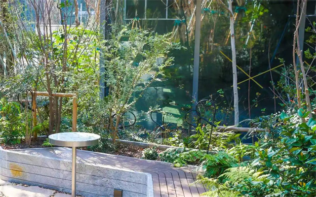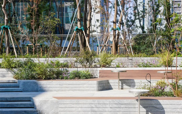 鑫耀中城三期景观由“Lab D+H大小景观”设计,现代感十足的办公楼宇与自然野趣撞个满怀。楼宇的玻璃幕墙上贴满了绿色花卉植物剪影,与林下真实的枝桠花叶交织成林,虚实相映间,仿佛整个空间都被春日的绿意包裹。漫步其间,会发现每一处景致都藏着“森森不息Co.Here”的设计巧思:乔木向上挺拔生长,恰似在此扎根的企业蓬勃向上;开花植物次第绽放,如同源源不断的灵感迸发,让原本严肃的商务环境,也多了几分鲜活与灵动;休憩长椅与石台桌错落其间,更兼顾了宠物友好的细节,营造出“企业森林”的共生氛围。