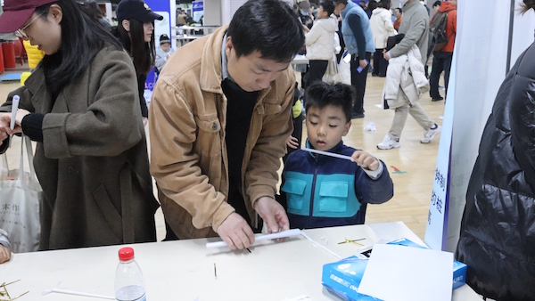 把A4纸尽可能撕出长条,将其围绕在泡沫城堡上,圈数越多越好。在“魔力纸条”项目前,记者见到不少孩子正全神贯注地撕着纸条,这份专注与周围的热闹形成鲜明对比。而在不远处,任哲正在和爸爸一起排队体验非遗漆扇,早早来到现场的他只剩下两个项目还没体验。“今天第一次体验同时做这么多项目,而且全部参与能够领取小奖品,非常开心。”任哲是上海市真光小学二年级学生,他最喜欢的项目是“能源归位”,通过操控倾斜的平台,将三个不同颜色球推进对应颜色的洞里。偏爱操控类体验的他也热衷机器人编程操纵,除了在现场项目中过了一把瘾外,他在课外已经积累了不少相关经验,自己编程设计的小车感应到墙体就能自动转弯,“我很喜欢机器人,会继续学下去。”