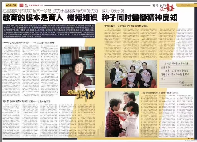 当年作文比赛的获奖者中许多人都考入名校,投身新闻界、教育界。她说,“学生的想法以后会远远超过我们这一代人”。她注重的是“培养对社会有用的人”这个大目标。这种格局与远见,正是当下青年教师最应传承的。她真是时代的标志。