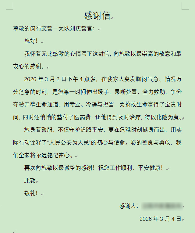 考虑到家属还未赶到,他又来到收费窗口,为沈先生垫付了1900余元医药费,之后便一直守候在旁,直到17时许家属匆匆赶到,才放心离开。所幸送医及时,为抢救赢得了宝贵时间,沈先生得到有效救治。事后,沈先生家属返还了刘庆垫付的医药费,并发来一封感谢信,转了500元表示感谢。“感谢费不能收,这是我们应该做的。”刘庆婉言拒绝。