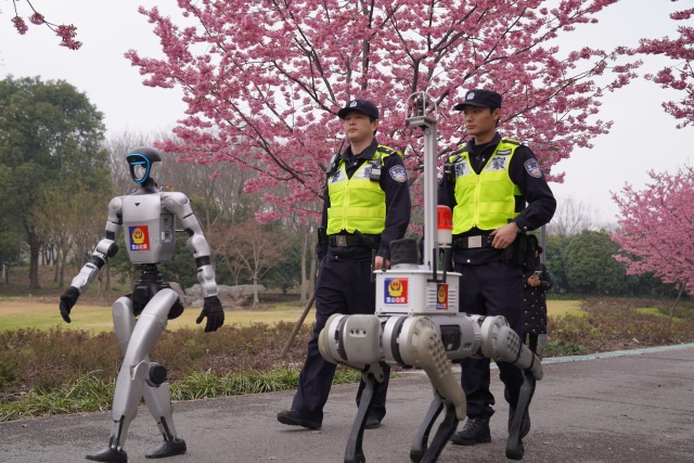 游园高峰日,治安管理支队引入巡逻机器狗开展辅助安保,通过实时图传、语音劝导、文明宣传,成为园区内的“移动安全哨兵”;无人机防控和安全管理大队利用自带夜视功能的小型警用无人机开展日常巡航,精准监测人流车流,为警力调度提供科学支撑。针对无人机“黑飞”隐患,警方在园内增设两个无人机信号探测点,实现公园上空全覆盖监控、快速定位处置,筑牢空域安全防线。与此同时,结合樱花节客流密集、园内道路空间有限的实际情况,特警支队组建骑巡队,采用“步巡+骑巡”相结合的模式,大幅提升巡逻机动性,确保各类突发情况能够被及时发现、快速处置。骑巡民警还专门配备专业骑巡装备包,内含止血带等应急物资,兼顾应急处突与便民救助双重功能,让游客切实感受到“看得见的安全感”。