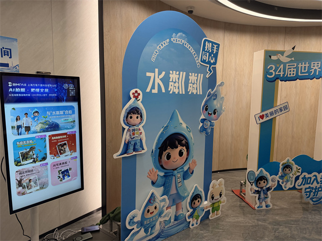 “水韵丹青”展区,23块诗、画、摄影展板与“水粼粼”IP互动装置吸引观众驻足;“水粼粼”展示区,萌态人偶与市民亲密合影,成为社交平台新宠;电子河长公示牌2.0展区,张家浜数字孪生水网以互动游戏形式科普水生态;“爱水护水”特色展区,海塘AI互动、雨污混接科普及水质净化实验,让市民在趣味体验中提升护水意识。