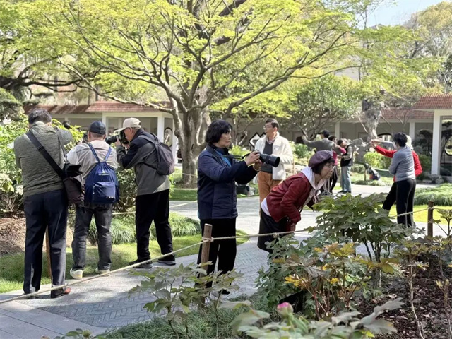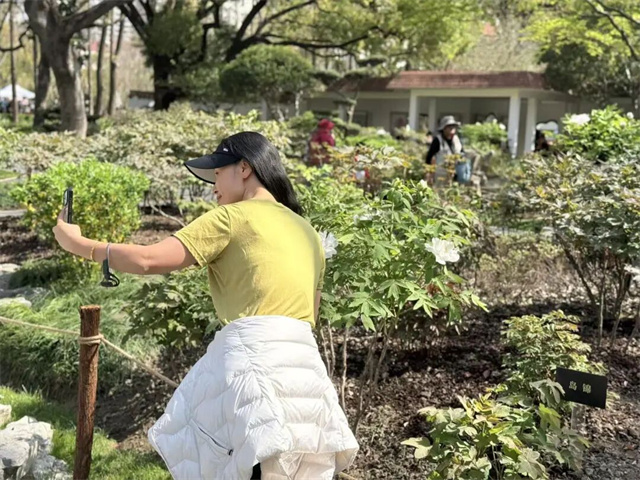 漕溪公园作为上海拥有百年牡丹数量最多的公园,前身是始建于1935年的曹家花园,园内8株清代古牡丹至今已有140余年树龄,与新植牡丹相映成趣,构成上海最大的古牡丹群落。园内,昌红、赵粉等早花品种眼下已经率先绽放,成为游园会的“主角”。昌红牡丹花色艳丽如霞,花瓣层层叠叠,花型饱满大气,盛开时如团团火焰,热烈奔放;赵粉则是牡丹四大名品中最年轻的品种,花型多变,或为清新荷花型,或为雍容蔷薇型,粉嫩花瓣自带淡淡清香,婉约柔美,尽显“粉黛娇容”之态。有的市民早早从外区赶来,有的更是带上了专业设备,只为赶这“头茬”盛景。“来一次不可能拍全的,晚的品种要到清明以后了”“拍特写的话,注意背景虚化。如果拍大的背景,要求这个光圈要大一点”熟谙门道的“老手”边赏花边分享自己的拍花心得。