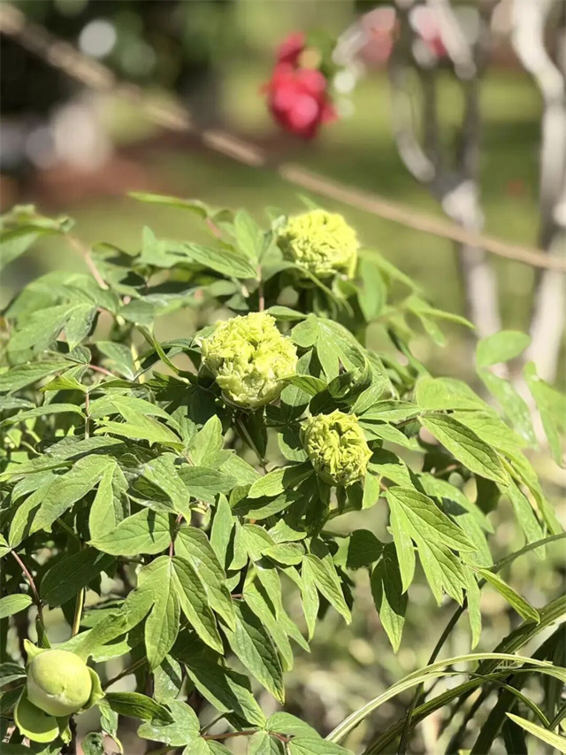 公园内,“姚黄”“皇冠”等名品也已初露芳容,蓄势待发,预计将在四月初迎来最佳观赏期,尤其是素有“花王”美誉的“姚黄”,盛开时淡雅鹅黄、尊贵大气的姿态令人期待。为丰富观赏品类,公园今年特意增加了绿幕隐玉、豆绿等绿色牡丹的种植数量,这些珍稀品种预计4月中旬陆续开放。绿色牡丹本就极为名贵,豆绿作为四大名品之一,初开时呈青豆般的翠色,盛开后渐转淡绿,阳光下泛着莹白光泽,花型为绣球型,清新脱俗,古时便有“欧家碧”的雅称。绿幕隐玉则以“娇容三变”闻名,花瓣初绽嫩绿,盛放时转为乳白,边缘泛着淡粉,如碧玉藏于绿幕之中,别具韵味。
