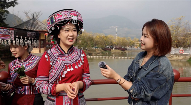 在牧羊河湿地公园,4.3公里的滨水步道串联起堤坝、观景台和长廊,漫步其中既能呼吸大围山国家级自然保护区的富氧空气,又能欣赏“山在花间流、人在花中游”的美景。在这里,不少游客穿上了苗族服饰,感受春日浪漫,体验民族风情。屏边苗族妇女服饰穿戴从头到脚都是由“花”点缀而成,这一身“花”来源于一针一线的挑花和刺绣。“穿上这身衣裳,算圆了自己苗族少女的梦,打卡拍照非常出片。”现场游客说道。