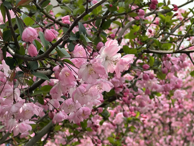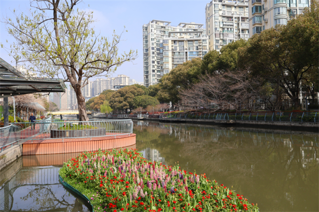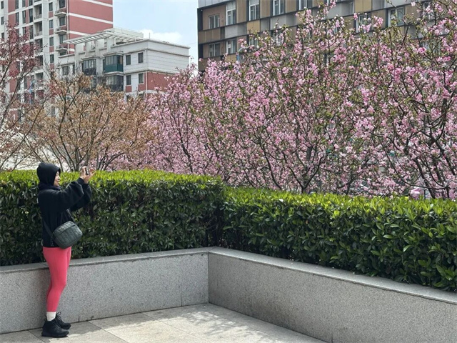 不少市民放慢脚步,举着手机定格这份“开门见花”的惊喜:有人对着海棠花簇拍特写,有人站在花境前和楼宇同框,把徐汇的春日浪漫直接装进朋友圈。