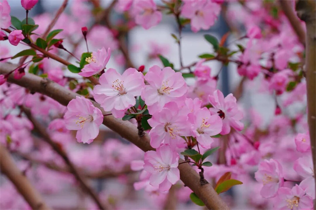 垂丝海棠攒着满枝粉霞,柔粉色的花瓣垂在枝头,风一吹便簌簌落下,给路过的行人撒下一场温柔的花雨。一旁的花境里,紫花地丁铺成淡紫绒毯,明黄小花缀在其间,与红檵木的深褐、金叶女贞的明黄层层叠叠,把地铁口变成了鲜活的春日调色盘。