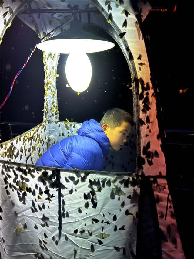 这个蛾类新物种的发现过程,凝结着浦东新区青少年活动中心教师团队与滕君乐的共同心血。2025年11月23日,浦东新区青少年活动中心张宁昆虫工作室主持人张宁和团队到浙江莫干山考察。当时已是深秋,夜间气温已跌至10℃以下,按照常理,气温低于15℃蛾类就已很少活动,此时并不是灯诱的合适季节,但多年的习惯和敏感度,还是让张宁在出发时带上了灯诱装备。抵达目的地后,他就布灯诱蛾。