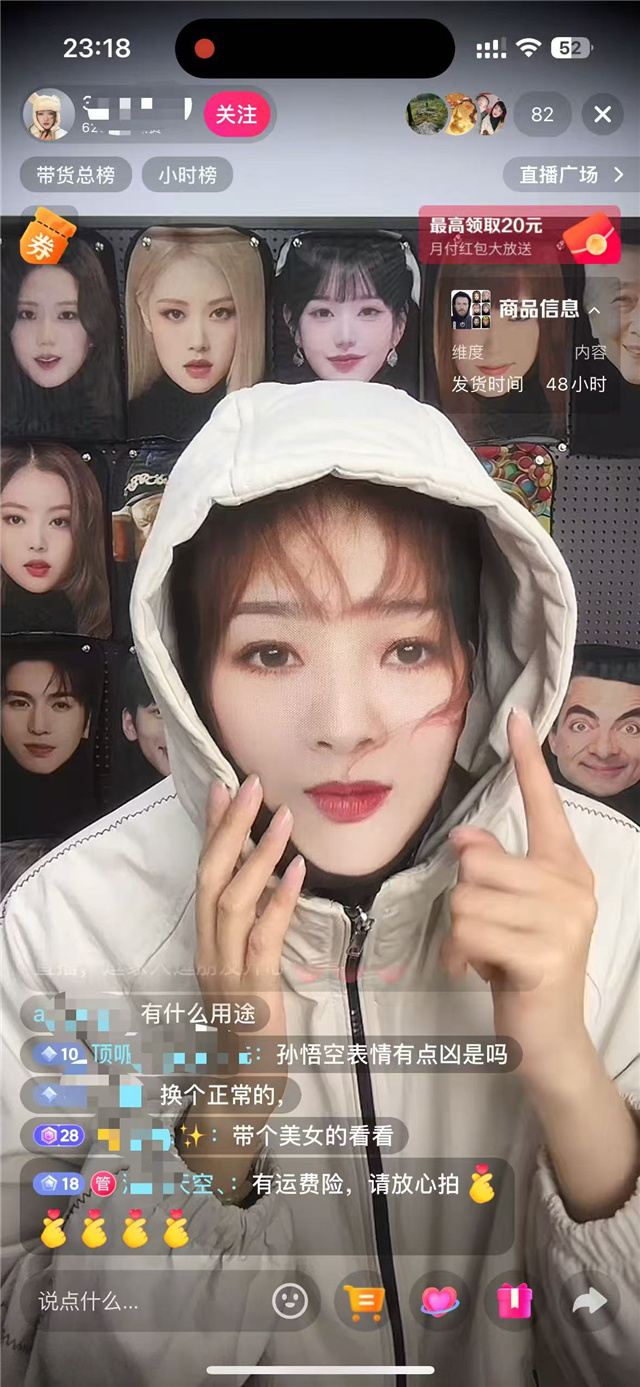 近日记者还发现,几十款印有明星头像的“网纱头套”的商品就在社交平台上兜售。主播在直播间内推销明星面纱头套,将外套的拉链拉紧,再戴上帽子,稍微调整面纱的佩戴角度,几乎可以达到以假乱真的地步。