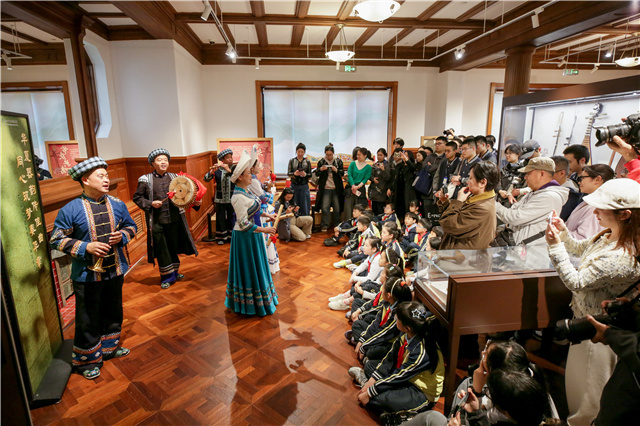 西南的贵州黔西南州布依八音坐唱,西北的果洛民族乐器弹唱,北方的内蒙古呼麦独唱……4月3日,当来自全国各地的民族音乐表演者齐聚上海音乐学院,准备晚上的民族团结主题专场音乐会前,他们先利用午休时间走进上音的东方乐器博物馆,来了一场午间沉浸式展演,以“导赏+演奏”的形式,为上海市民和中小学生展示中华民族多元音乐文化的魅力,受到了观众的热烈欢迎。这也是第41届上海之春国际音乐节上音音乐开放周的系列活动之一,上音方面表示,上音的校园开放已不止于物理空间的开放,而是将艺术内容和艺术普及、立德树人结合起来,推动高质量开放。