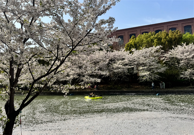 市民边划船边赏花。