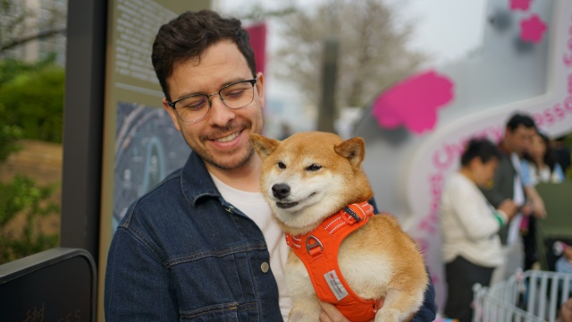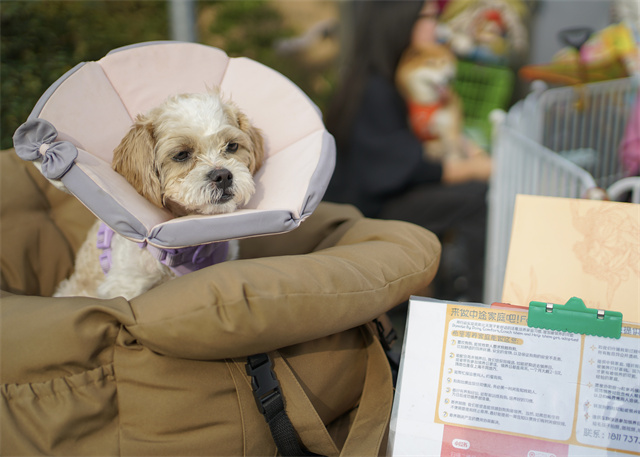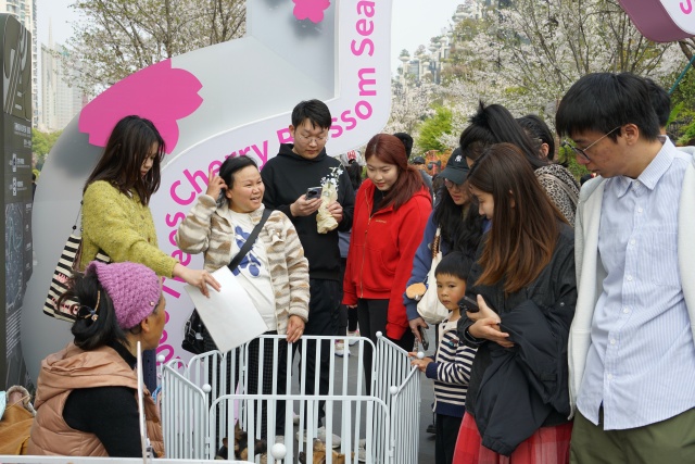 四月的天安千树长廊樱花盛放,市集人流熙熙攘攘。循着广播里反复播放的“免费领养‘上过学的狗狗’”走去,入口处的摊位前早已围满了人。