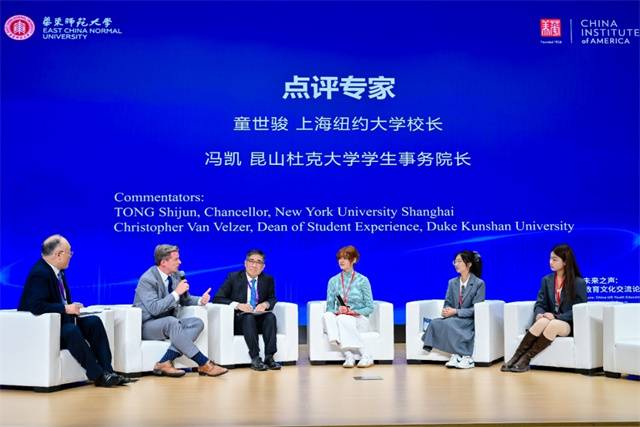 除了中学生,在“未来课堂与教育变革:青年视角的教育想象”的中美大学生对话环节,来自上海纽约大学和华东师范大学的中美大学生围绕人工智能时代的高等教育、学习变革及未来教育想象等议题发表观点,并与上海纽约大学校长童世骏、昆山杜克大学学生事务院长冯凯(Christopher Van Velzer)进行了深入探讨。