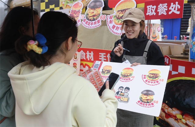 尽管受阴雨天气影响,现场依旧人气不减。来自青岛的BLACK BIG堡藏汉堡摊位前,排队的队伍已经超出了自家点位范围。创意食材的跨界融合,成为这家汉堡店的排队密码。