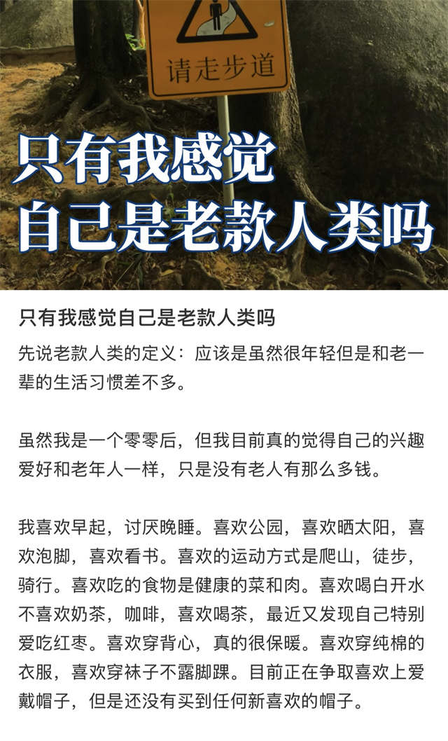“耳机里循环着十年前的老歌,逛街只买经典百搭款,保温杯泡着枸杞菊花茶四季不离手,周末宁愿去公园发呆也不去挤网红打卡点……”如果你对这些“症状”感到似曾相识,那么恭喜你,可能已经被“确诊”为“老式人类”了。最近,这样的“诊断书”成为网络热词,年轻人为何热衷于给自己贴上这样的新型标签?