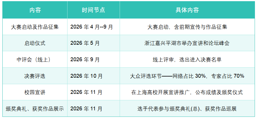 3. 决赛流程:2026年9月,竞赛专家委员会将对参赛作品进行统一评审,选出入围决赛的团队,开展网络投票,最终评出大赛各项奖项,择日颁奖。