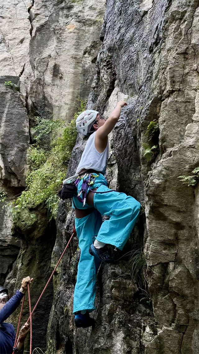 直到回酒店洗澡时,00后岩友江榕才发现自己双腿已经布满青紫。几小时前,她刚在真实的野山岩壁上完成人生第一次攀岩。贴在岩壁上低头往下看,没有室内岩馆里那块铺满全场的厚实软垫,只有真实的山体、碎石和绳索保护。“当时根本感觉不到痛,腿一直在抖,但看到远处的风景时,人是极度兴奋的。”