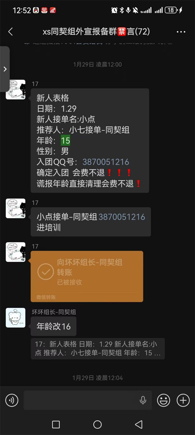 记者根据小孙提供的线索进入陪玩群,进群之前全程没有验证年龄和身份信息,仅进群后要求成员填写相关信息。虽然群内公告显示“谎报年龄直接清理”,但记者发现,群主明知许多成员未满18周岁,也没有强行令其退群,而是要求新人修改年龄信息,以此规避监管。