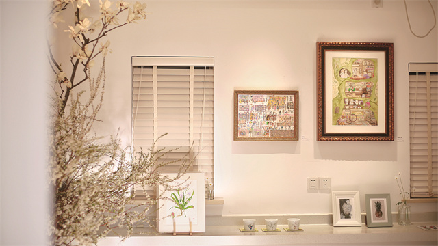 十多年间,钱斌画了200多张作品,今年开春,她在永福里举办“一米之距”个展。她还将那张画桌搬到了展览现场,展示自己的工作状态。