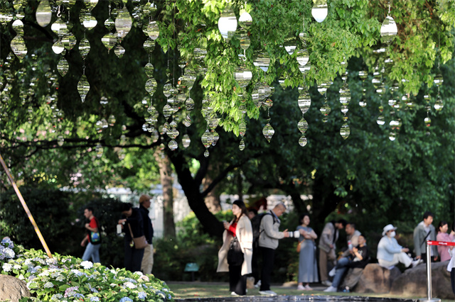 古城公园会场今年首次亮相,亮点颇多。公园被打造成“城市记忆的生态花园”,艺术家溯源老城厢33座古典园林,以明代园林造景理念与城市变迁为灵感,打造透明板材重构的“日涉园”三十六景、镜面环绕的“古树秘境·浮岛繁花”,入夜后“林涧寻芳”光影点亮,花影与灯火交织成诗,让园林文脉与城市生态完美契合。