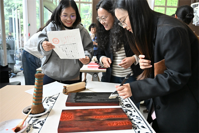 其中,“书藏有象”是图书馆品牌古籍活化活动。图书馆推出的雕版母版选取进入《国家珍贵古籍名录》的《柳文》和进入《上海市珍贵古籍名录》的《选诗》,均为图书馆馆藏。馆员详细介绍雕版制作、上墨、铺纸、刷印等一系列传统工艺流程,每一道工序都凝聚着先人的创造智慧,承载着中华文脉的传承印记,也让在场师生深刻认识到这一非遗技艺对文化与文明传播的重要意义。师生们还纷纷化身“传统匠人”,亲身参与雕版刷印的全过程,让文化传承变得可感可触。