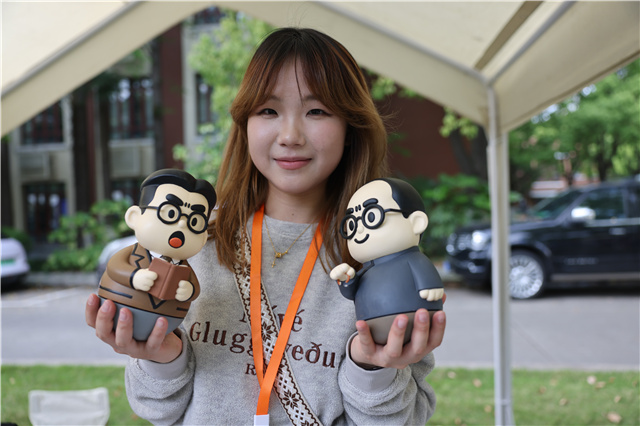 实际上,草坪上有故事的创意远不止一家。长长的摊位上,既有过往获得“挑战杯”上海市特等奖的非遗研究团队,也有聚焦红色文创的“知行杯”上海市二等奖团队。“这些产品已用于和场馆合作。”红创客团队、设计学专业学生鲁凌越展示着摊位上的可爱不倒翁,“像这款就是为龙华烈士陵园设计的,寓意‘英雄永不倒’。我们希望以更有趣的方式传递红色文化。”很快有学生凑上前询问价格,鲁凌越一一作答。